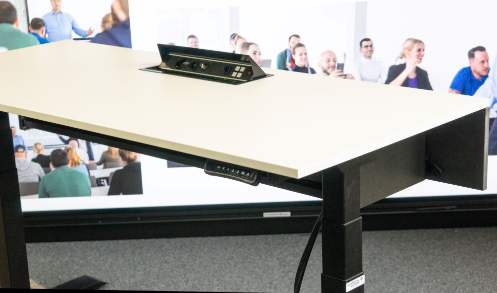 Als integrierter Medientisch vereint er elektrische Höhenverstellung (70–120 cm), geschützte Technikaufnahme und strukturiertes