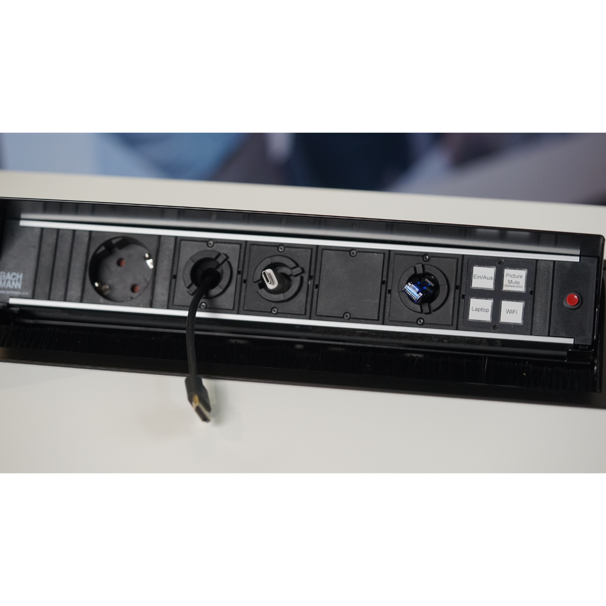 Ein integriertes Anschlussfeld mit individueller Bestückung und eine mit NFC-verriegelte Untertischbox sorgen für saubere