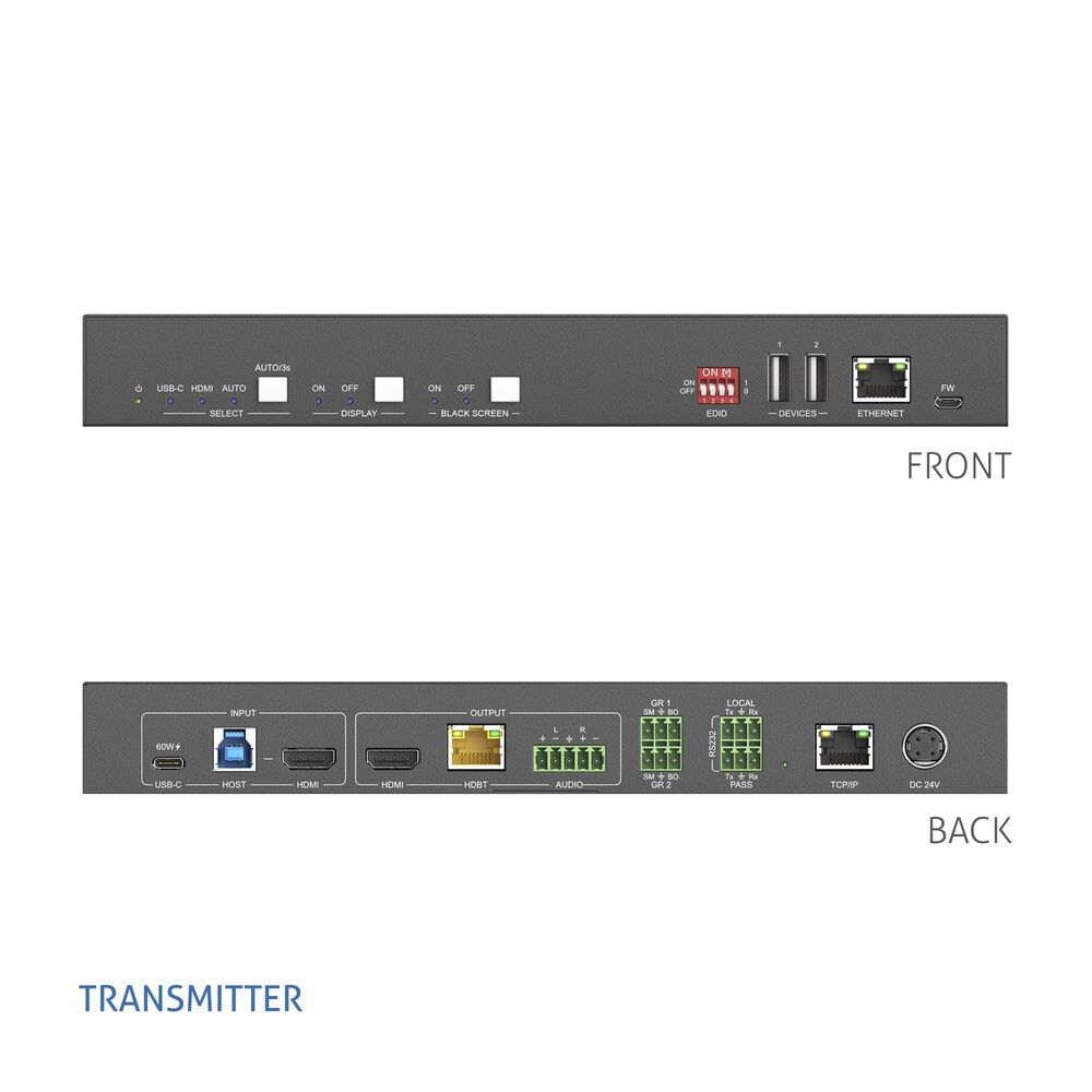 RX: 1× HDBaseT (RJ45), 4× KVM (3× USB-A, 1× USB-C)